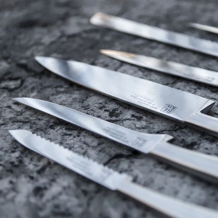 而在生产加工层面,knIndustrie与知名刀具生产商Certellerie Berti深度合作,基于后者强大的技术积淀,高碳钢材质的硬度,韧性以及耐腐蚀的缎面处理等性能表现对于定价而言均有溢出,所以knIndustrie刀具的另一出众之处就是极高的性价比。