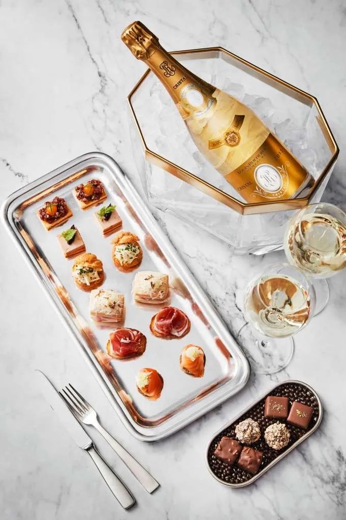 在晚餐之前,可以提前与三五好友来到怡庭大堂吧,品尝由瑰丽酒店携手路易王妃香槟呈现的「圣诞限定下午茶」。套餐内包含牛肉挞挞、鹅肝批、腌三文鱼,蟹肉乳酪泡芙和巧克力果仁等,各种口味的甜点咸点一应俱全,再搭配一杯 2012 年份路易王妃水晶香槟,将节日季甜蜜值拉满。