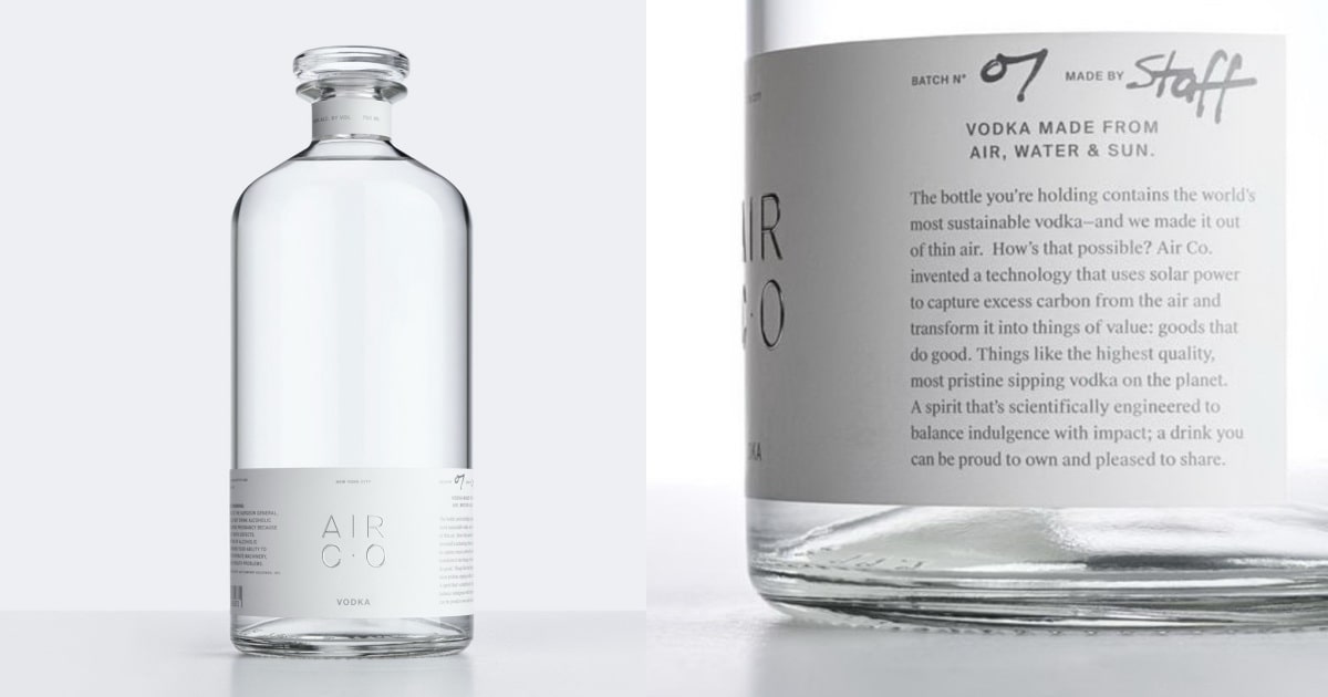 传统的伏特加由小麦或土豆等富含淀粉的谷物发酵而成,这个过程会产生约13磅的温室气体。 创始人之一康斯坦丁(Gregory Constantine)说,只由水和二氧化碳制成的Air Co.伏特加,每生产一瓶,会从空气中吸收一磅二氧化碳(相当于八棵大树的高度)。 我不由得为这两位哥们儿竖起了大拇指。