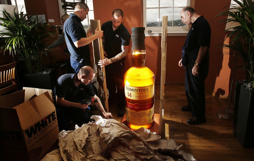 托明多尔(Tomintoul)14年的这瓶容量105.3升的巨型威士忌,曾一度被评为世界之最。总重180公斤,相当于150个标准70cl的瓶子。2009年以46%的ABV装瓶,巨型软木塞、巨型标签,据说装瓶密封启用了14人的团队才完成。