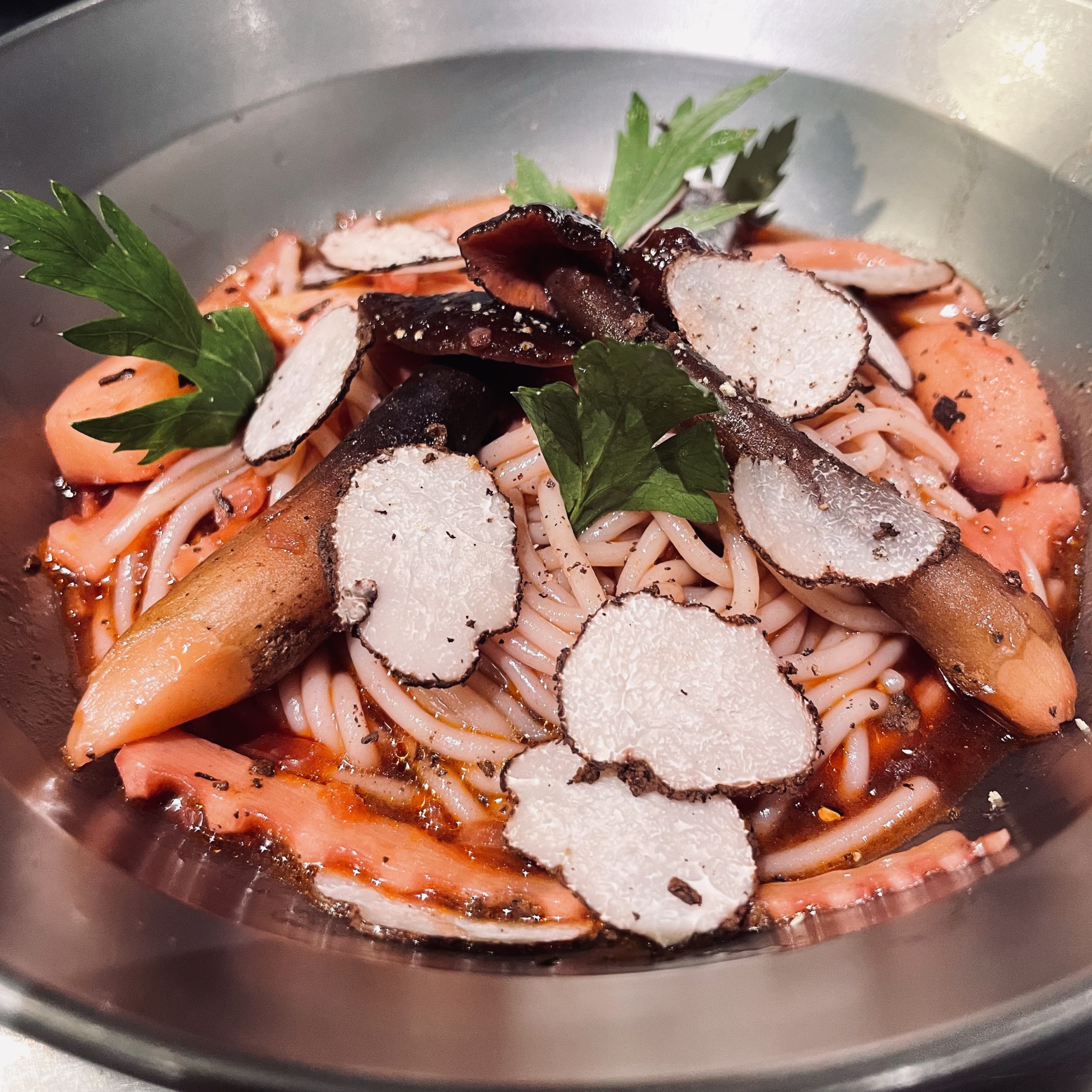 由于现在身边吃素的朋友越来越多,我就想着怎么把红米线做成一道纯素却又不失幸福感的菜,先用油煸炒冬笋、野菌和荸荠,加入菌菇高汤,然后烩入红米线,出餐时用香格里拉黑松露来提升风味。同时,这又是一道特别适合露营的主食,做起来很方便。