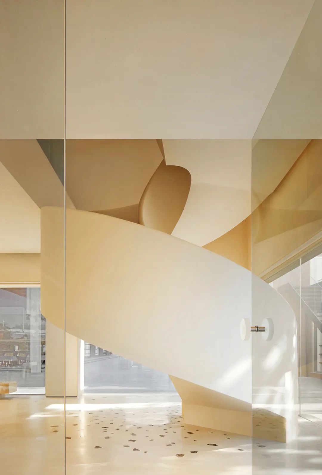 连接三层空间的旋转楼梯,也是在垂直维度上对“圆”的演绎。源自品牌崇尚自然环保的理念,楼梯使用的老山木来自广东老房子翻新时拆下来的房梁龙脊,原本废弃的材料被赋予了二次生长的魅力,从一层空间开始盘旋而上,具有力量感的体块和优雅的弧线结合,在光斑水影的映射之下,强化了空间的浪漫主义。