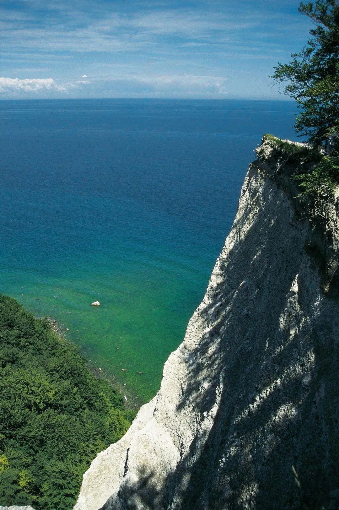 现在白垩岩常见于欧洲,比如在德国东北部的吕根岛上,就有一段超过15公里的白垩岩海岸,岩石最高处达118米,被称为“国王宝座”。站在崖顶俯瞰,海浪拍打着独特的白色岩石,吸引无数游人前来观赏。