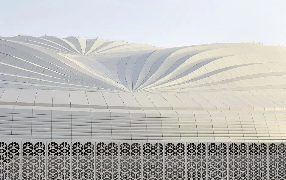 Zaha Hadid Architects 为2022年卡塔尔世界杯建造的首个新体育场,屋顶和檐下使用了白色和灰白色的光面覆层,犹如贝壳。