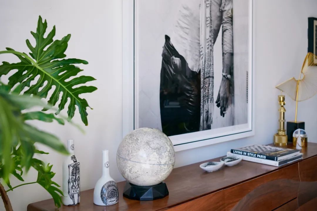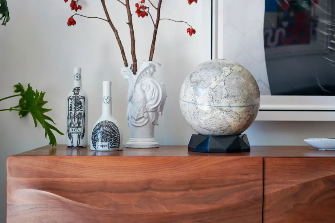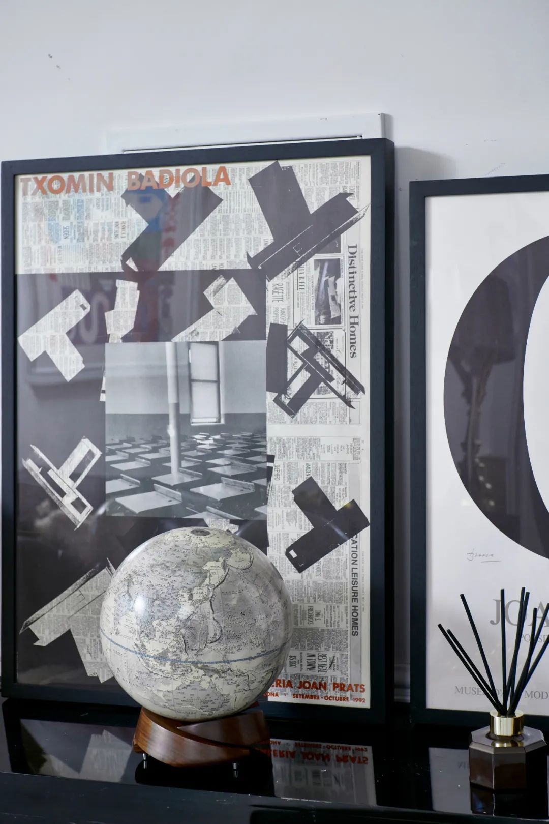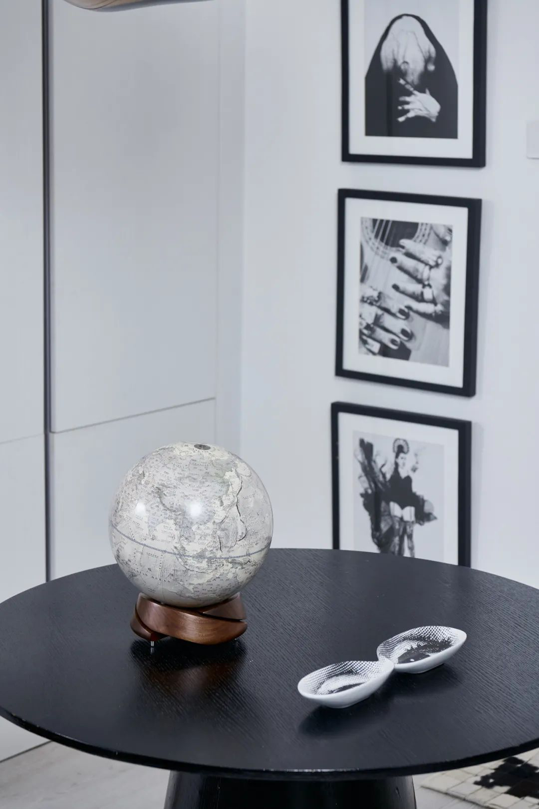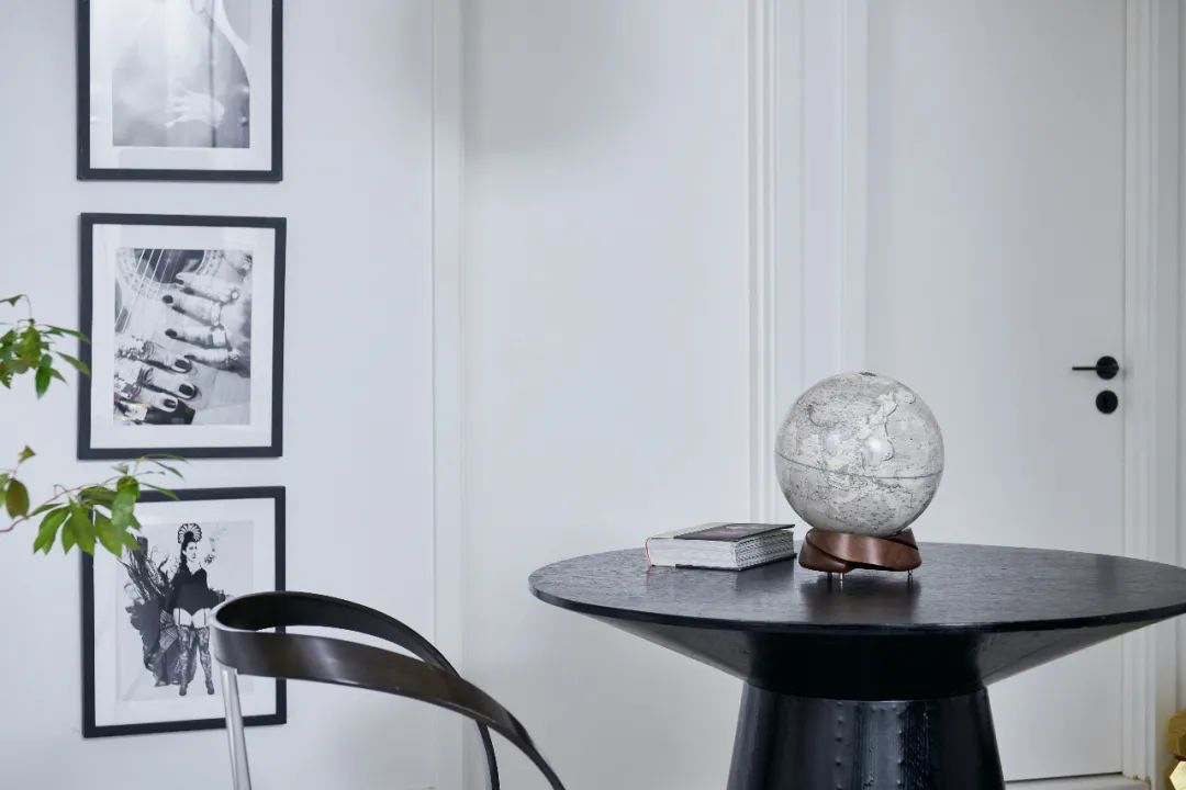 黑色细边相框搭配无彩色摄影或剪贴作品,勾勒出艺术之美,一只垩岩白地球仪与之形成绝佳映衬。