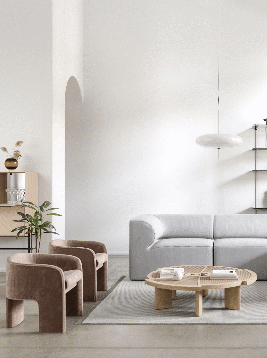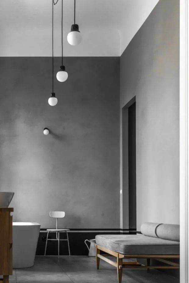 水泥墙自带灰色,占据画面的大部分,灰白色的单椅和黑白吊灯一起调节气氛。