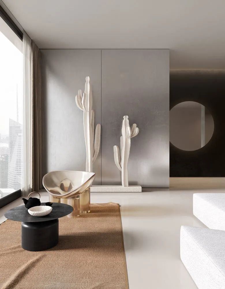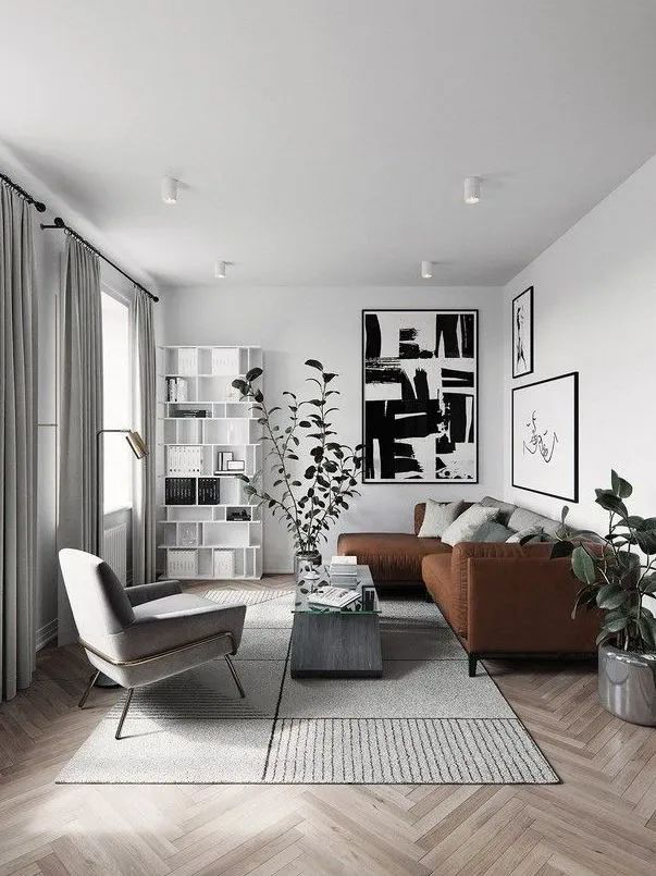 棕色在灰白色包围下格外吸睛,空间中制造1-2个视觉重点即可。