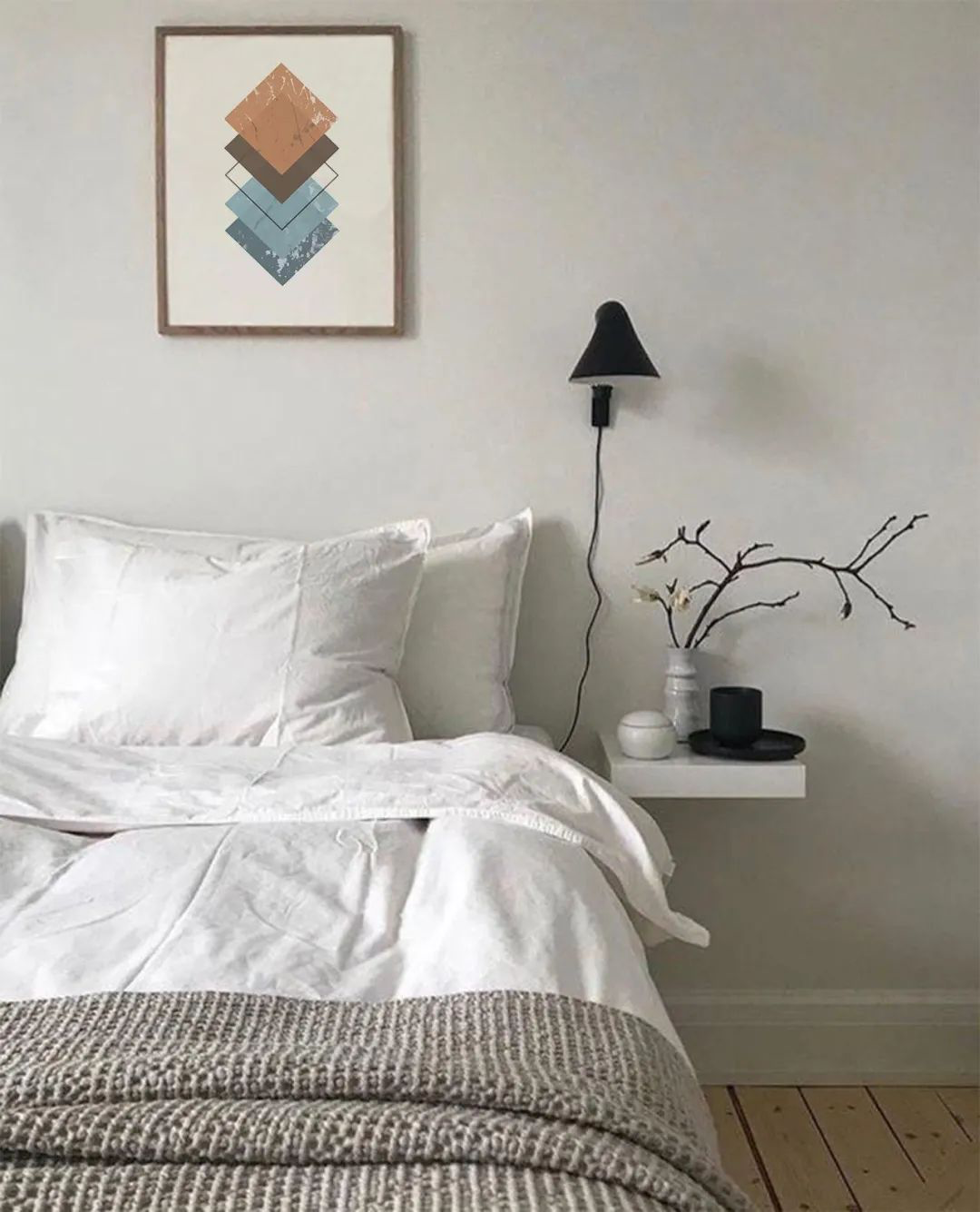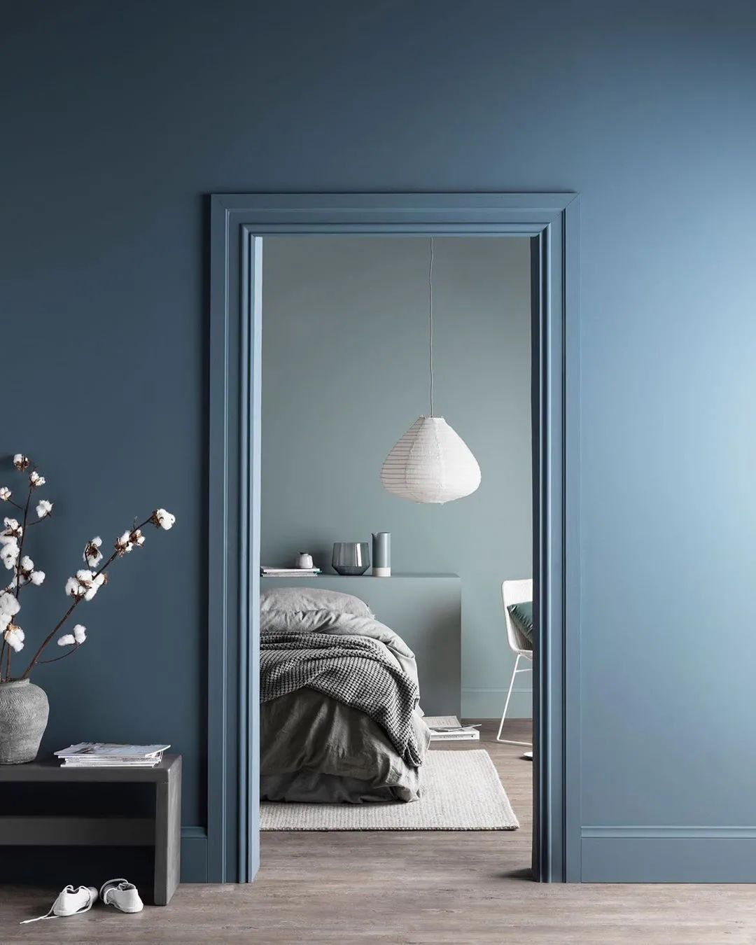 明度稍高的灰蓝,与灰白床品、地毯放在一块,完全可以温婉风组团出道。这画面,岁月静好啊~