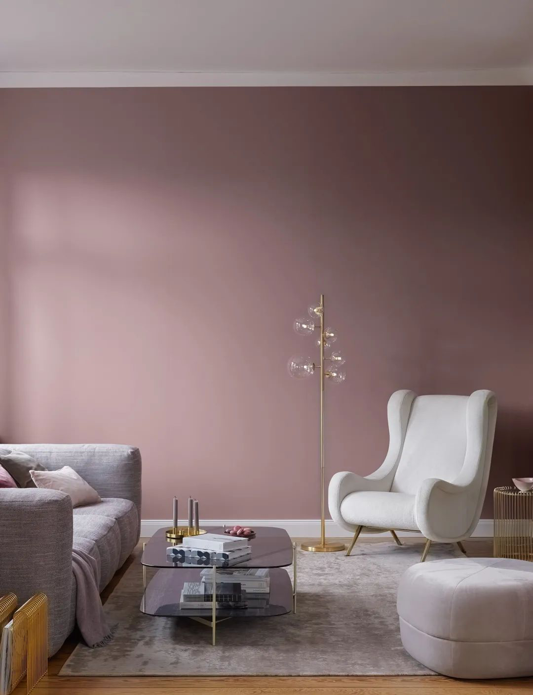 这几年走红的烟粉色也可以用不同程度的灰色搭配,构造出静美的客厅一角。