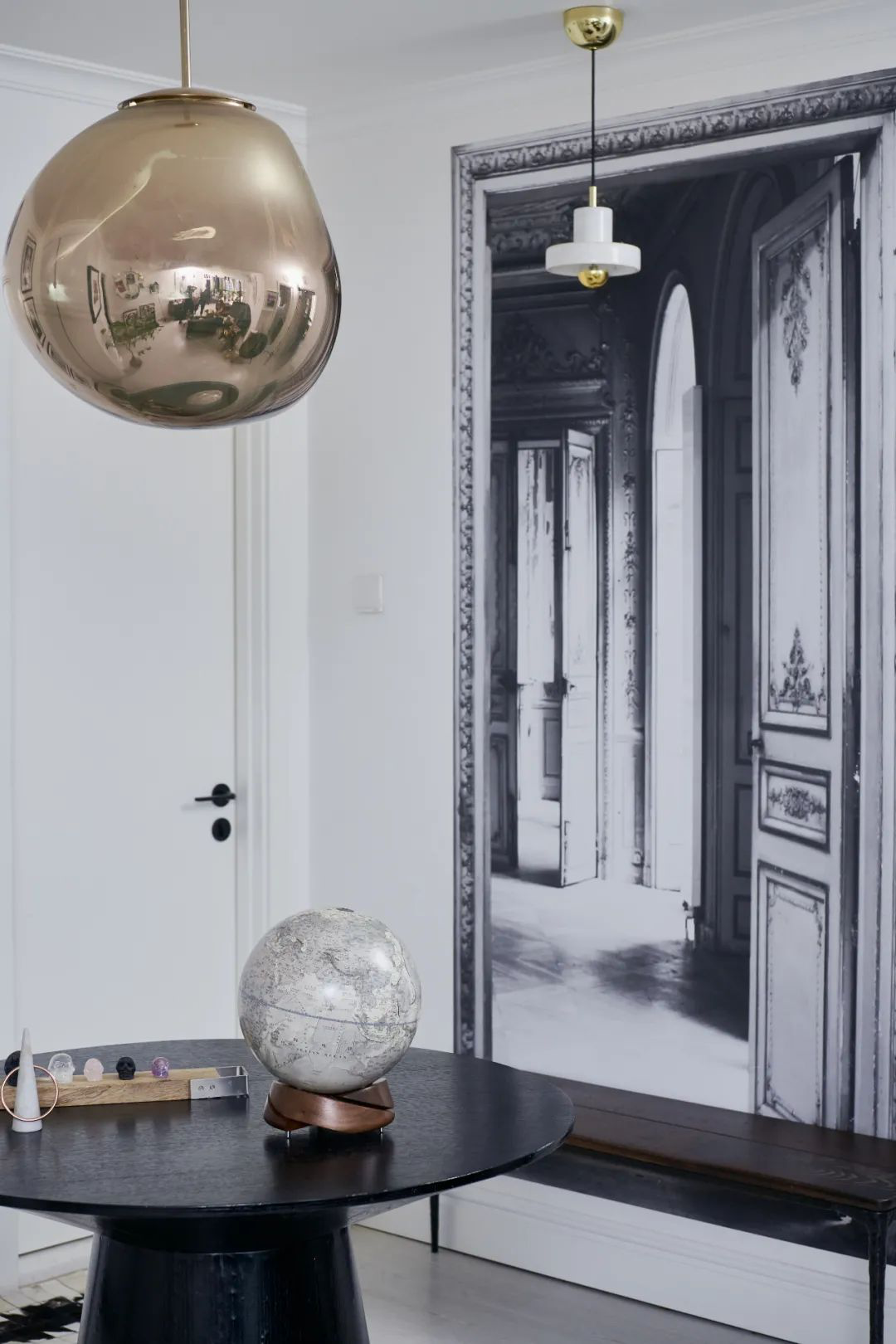 金属色也是灰白色的好伙伴,比如金色就能让空间瞬间拥有闪光点。不惧晦暗,只要有一只地球仪,凭借它亮眼的底座,足以为生活增色。